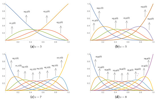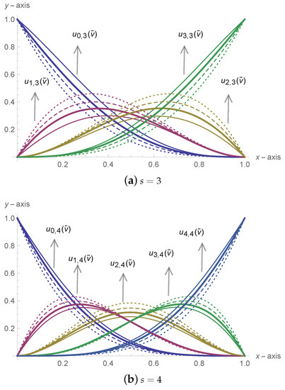 - Non-negativity: When , .Proof.By induction for s. If , we will rewrite the Bernstein-like basis functions as:Obviously, when , we have , . In fact, let us recognize that the cubic Bernstein-like basis functions are non-negative. The Bernstein-like basis functions of degree 2 are therefore non-negative.Now, suppose that the Bernstein-like basis functions of degree t are non-negative. We obtain from Equation (6):By our inductive hypothesis and the fact that , , we can conclude that the Bernstein-like basis functions of degree are non-negative. □