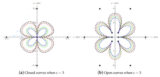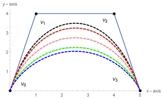 - Shape adjustable property: With the control polygon, the form of the famous Bézier curve can be fully decided. Yet, this is not the case for the Bézier curve. Promising to fix the control polygon, the form of the Bézier-like curve can also be changed by adjusting the shape parameters.Figure 3 displays four Bézier-like curve of degree 3 with similar control polygons with different shape parameters. From the figure, we can see that the Bézier-like curve introduces the control polygon by increasing the shape parameter. Besides that, since the Bézier-like curve seems to be just the classical Bézier curve when .