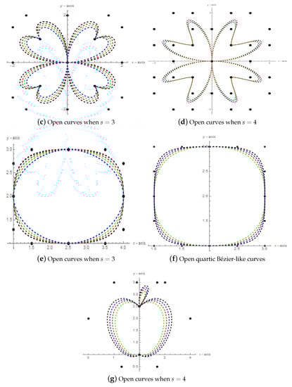Here, we construct some free form curves by different degree of Bézier-like curves with different value of shape parameters. A curve is said to be closed curve if its first and last control points are equal otherwise it is open curve. Figure 4a shows a closed cubic Bézier-like curve with different value of shape parameters. In this figure, the blue curve is for the green curve is for the red curve is for and the black curve is for Figure 4b,c,e show open cubic Bézier-like curves with the same shape parameters as mentioned above. Figure 4d shows an open quintic Bézier-like curve with with the same shape parameters as mentioned above. Figure 4f,g show open quartic Bézier-like curves with the same shape parameters as mentioned above. In Figure 4g, the leaf shows a closed cubic Bézier-like curve with different value of shape parameters.