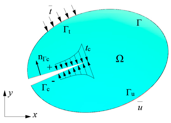 Consider a two-dimensional domain Ω crossed by a cohesive discontinuity, as shown in Figure 2. The strong form of the equilibrium equation of this body can be expressed as