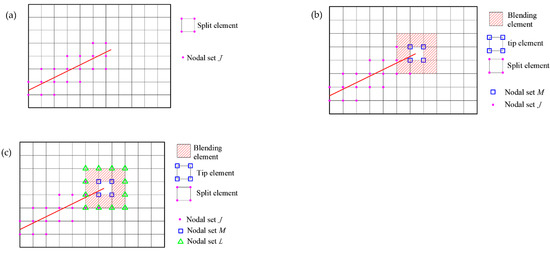 As marked in Figure 3b, J is the set of nodes whose supports are intersected with the crack, and M is the set of nodes whose supports contain the crack tip. If a node simultaneously belongs to J and M, then it belongs to M.