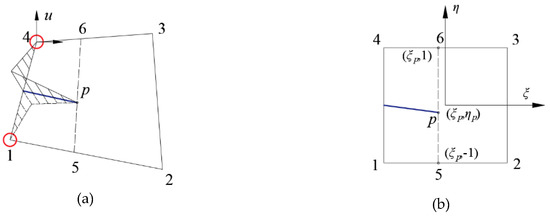 In order to make the displacement gap vanish to zero at the crack tip within the tip element, we extended the method proposed by Zi and Belytschko [29] to quadrilateral elements. Specifically, for the tip element, the modified shape function was used instead of the standard shape function . As shown in Figure 4, if the crack intersects with boundary 14 within the tip element, we make a straight line through the crack tip point and intersect the element boundary at points 5 and 6. Then, the shape function used for the tip element is actually the standard shape function of virtual element 1564. Since nodes 1 and 4 are enriched, the discontinuous part of the displacement can be written as