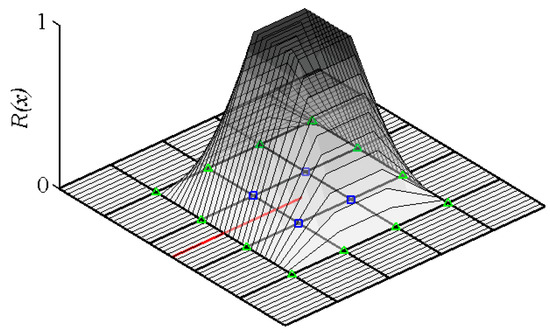 where L is the set of second-layer nodes around the tip element, as marked with triangles in Figure 3c. In this scheme, the set of nodes L is also enriched with branch functions and additional DOFs . R(x) is a ramp function, which is defined as follows and depicted in Figure 6.