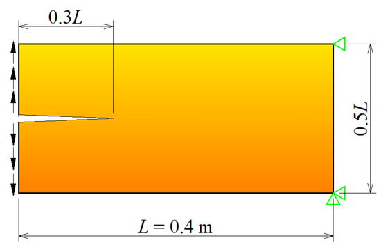 In this study, a double-cantilever-beam (DCB) specimen containing a level cohesive crack was numerically simulated by the above four different enrichment schemes in order to examine their accuracy and convergence performance. This configuration was taken from the literature [29]. The boundary conditions and dimensions of this case study are provided as a sketch in Figure 7. Uniformly distributed forces were applied on the left side of the beam, and the plane stress condition was assumed to hold. The Young’s modulus was 36.5 GPa and the Poisson’s ratio was 0.18, which are the material properties of common concrete.