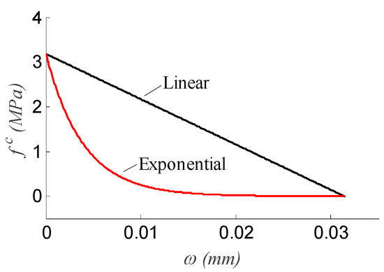 In this paper, the material properties of common concrete were used, where the tensile strength and the critical crack opening . The fracture energy was . The plot of this softening model is provided in Figure 8.