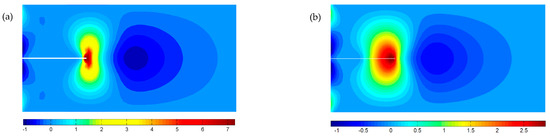 In order to investigate the effect of an additional singular branch function in Equation (14), only was employed in XFEM-c1, while both and were employed in XFEM-c2. It can be seen from their plots in Figure 5 that the branch function can help to capture the stress gradient at the rear of the crack tip. In both schemes, a corrected approximation in blending elements is used to eliminate the negative influence of parasitic terms.