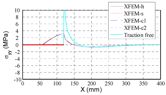 The stress σyy along the axis of symmetry is plotted in Figure 11. The stress profiles obtained by different enrichment schemes are difficult to distinguish from one another. They also show an obvious FPZ ahead of the crack tip, and the stress σyy is equal to the tensile strength at the crack tip. In contrast, a stress singularity appears around the crack tip in the traction-free crack problem.