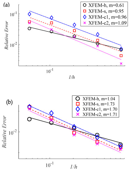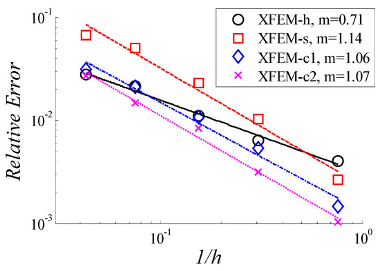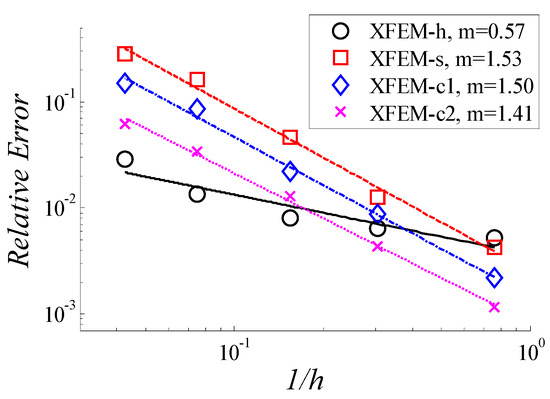 Figure 12 shows the relative error in the L2-norm plotted against the inverse of the element size h, which is taken as the square root of the area of the element. The rates of convergence were obtained by means of polynomial curve fitting of those data points. It is interesting that, as the linear softening model is considered, with the employment of the branch function , XFEM-s, XFEM-c1, and XFEM-c2 achieve a better convergence rate of more than 1, compared with the 0.7 obtained by XFEM-h. The employment of the additional branch function results in a similar convergence rate but a higher accuracy.