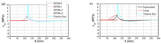 The stress σyy along the symmetric line produced by different enrichment schemes is provided in Figure 13, as well as a comparison of the two cohesive constitutive models. Likewise, the stress profiles produced by these enrichment schemes are hard to distinguish from one another. It can be seen from Figure 13 b that, when the traction–separation relation changes, although the cohesive force remains equal to the tensile strength at the crack tip, the stress gradient differs in the FPZ, and does not make much difference at the back of the crack tip.