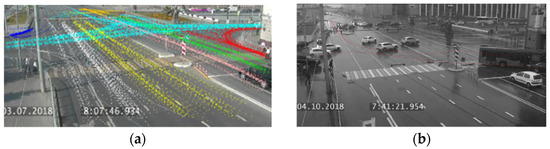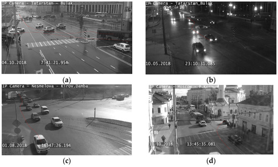 The main research question we considered in this paper concerns approaches and algorithms for processing trajectory data. Video data from 165 enforcement cameras, which are installed at road intersections in Kazan city, were considered as raw data (Figure 1). Video resolution is 1280 × 720, while a frame rate of 10 frames per second is used. We covered all CCTV cameras installed at road intersections in Kazan. The dataset involved 24-h recording from each camera done in one day. Following road intersection types have been included (Figure 1):