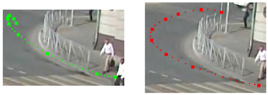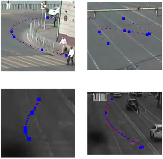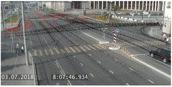 Source trajectory data in our case contain objects of different lengths and covered distances. However, due to object detection accuracy and tracker errors, some trajectories may be very small and may not look well. In contrast with the case of lost location, where the missed location can be found using approximation and regression models, the lost tracking object cannot be fixed afterward. For that reason, to improve the quality of results, it was decided to filter the input trajectories and ignore short trajectories with small covered distances. The covered distance is calculated as a Euclidean distance between the first and last TPs. We used minLength = 10 (TPs), minTotalDist = 80 (pixels) parameter values trajectories filtering. The results depicting the removed (red) and kept (black) trajectories are shown in Figure 5.