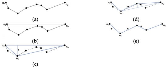 Trajectory thinning using the RDP algorithm. (a) Initial trajectory; (b) Point-to-edge distance; (c) Separation trajectory into segments; (d) Selection points for keeping; (e) Final trajectory.