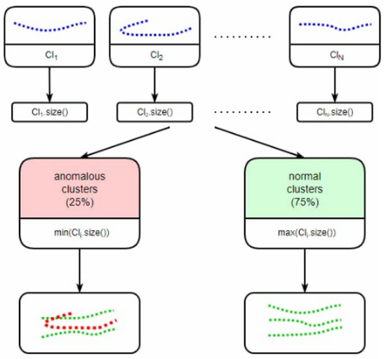 Clustering is done in an unsupervised manner using a hierarchical clustering algorithm operating on a distance matrix between trajectories. To perform clustering, the modified LCSS distance is used as a similarity measure. The general scheme of normal and abnormal cluster construction is represented in Figure 7.