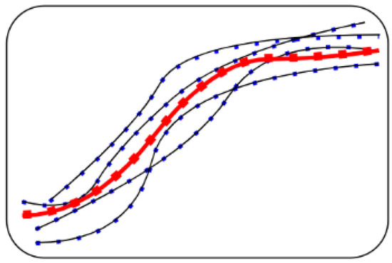 Another approach for solving the trajectory thinning task by reducing the number of points in a trajectory curve is Ramer-Douglas-Peucker (RDP) method. The basic idea of RDP is taking the initial trajectory and seeking another curve with a fewer number of TPs [29]. Figure 6 depicts the process of curve thinning using the RDP algorithm [30]. The method requires an initial trajectory curve consisting of an ordered set of TPs and predefined point-to-edge distance tolerance ε > 0, controlling the remoteness. The input trajectory curve is being recursively divided into segments, while the first line segment (edge) is defined by the first and last points as ends. Then, the algorithm determines the farthest point for the current line segment (line) and decides whether we need to remove or keep the point based on ε. The recursive process continues until all points from the initial curve satisfy the point-to-edge tolerance. The simplified trajectory curve can be obtained by choosing only points marked as kept. In the paper, the RDP N trajectory thinning algorithm was used to ensure the required number N of approximation points.