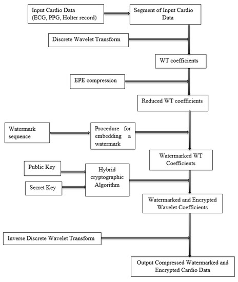 This paper aims to provide an effective cryptographic solution that is sufficient to address issues related to the challenges of transmitting biomedical signals and data (providing protection, preserving the integrity of data, and the confidentiality of patients’ personal information). The proposed protection procedure is applied to three types of cardio data: ECG, PPG, and Holter records. All tested signals are real and received with either a PPG device (ECG and PPG) or Holter, which are created or purchased under a research project “Investigation of the application of new mathematical methods for the analysis of cardiac data” in which the authors of the paper participated. The implementation of the proposed procedure is implemented in the Microsoft Visual C++ software application. All steps of the procedure have been studied: EPE-based compression algorithm, performing a wavelet transform based on Daubechies, embedding a watermark in the wavelet coefficients obtained at the lowest level of reconstruction, and hybrid algorithm encryption. From the study of algorithmic methods with evaluation parameters, it can be concluded that cardio data (ECG, PPG, and Holter records) that is decrypted and transformed with inverse wavelet transform retain their diagnostic characteristics, having sufficient accuracy compared to the original data.