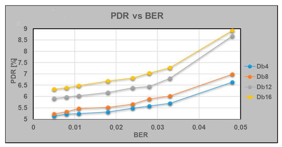 Implementations of the cardio data protection procedure with different wavelet bases affect the dependence of PRD on BER (Figure 10). Using Db4 and Db8, more optimal ratios of the studied parameters were obtained. When using the wavelet bases Db12 and Db16 with an increase in BER above 0.03, a significant increase in PRD values was observed. The results were obtained in studies on PPG.