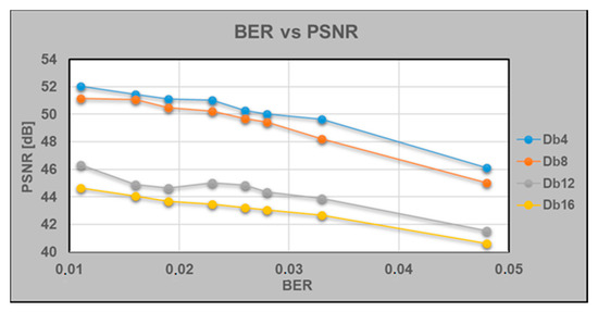 Dependence of the PSNR coefficient on BER in the implementation of cardio data protection procedure with different wavelet basis.