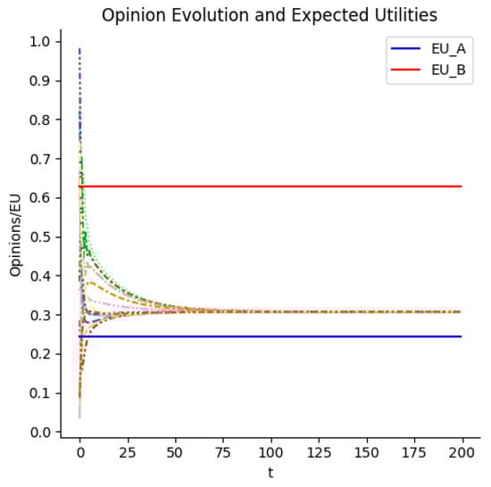From Equation (6), the opinion evolution of all agents in the network is shown in Equation (7).