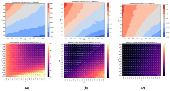 From Figure 3, we found that the competition outcome increased monotonically with and decreased monotonically with , which is in line with the FOCs shown in Equation (29). The competition outcome was more sensitive to the change of firm B’s unit cost in the case of , while the competition outcome was more sensitive to the change of firm A’s unit cost in the case of . For the case of , the unit cost of each firm had a symmetrical effect on the competition outcome. Moreover, according to Proposition 1, the value of the RRE determines the equilibrium-expected utilities of firms A and B, and . Figure 3 implies that the RRE will take the value of if unit costs of firms A and B are both high enough. Conversely, the RRE will take the value of if the unit costs of firms A and B are both low enough. In other words, the level of unit cost affects the equilibrium results by influencing the value of the RRE. High unit costs hinder the enthusiasm of firms to allocate budgets, while low unit costs promote firms to use up their budgets as much as possible.