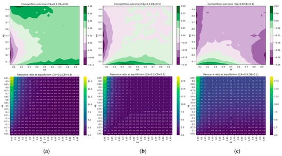 As Figure 4 shows, the effect of budgets on the competition outcome is quite complex and non-monotonic, which is consistent with the FOCs shown in Equation (32). By comparing Figure 2a–c, we found that a firm with a low unit cost dominates the competition. The budget has a very limited effect on reversing the competition outcome when there is a great disparity in unit costs between firms. As seen in each subgraph of Figure 4, the change of budgets can only have a large impact on the competition outcome if there is a disparity between the budgets of firms A and B. For a given budget of the opponent, each firm can assess its chances of winning and optimally adjust its own budget to ensure a win based on Equation (28). Furthermore, such an adjustment is not unique due to the non-monotonicity of the effect. Each firm can take advantage of the non-uniqueness to make a minimal budget adjustment for a win.
