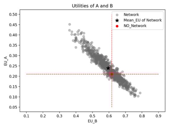 Since the relationships between agents are diverse, there are many possible structures for the network. From Figure 5, the diversity of network structures allows for multiple possible results for each firm’s expected utility. Expected utilities of firms in the case of agents with connections may be greater than or less than those in the case of agents without connections. For both sides of the competition in the market, the network structure may be used as a tool to improve utilities.