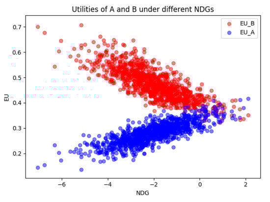 From Figure 6, the expected utility of firm A is positively correlated with the NDG, while the expected utility of firm B is negatively correlated with the NDG. Obviously, the network dominance is retained in equilibrium and manifested in the expected utility of each firm. A positive and large NDG often means that the network has an advantage for the marketing campaign of firm A, i.e., is generally greater than , while a negative and small NDG means that is generally less than . For any given initial opinion profile, the NDG implies that the difference between expected utilities of firm A and B varies continuously under different network structures. Consequently, the structure of a network can indeed be used as a tool for firms to improve their expected utilities, which is in line with [12,25]. Therefore, it is quite necessary for firms in the market to investigate the consumer network and improve its structure accordingly. Meanwhile, each firm can choose its optimal marketing strategy under different network structures.