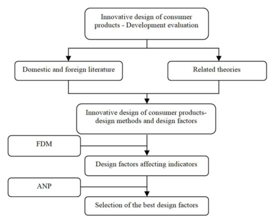 This study is divided into three stages. In the first stage, general product design methods and design factors that consumers value are sorted out based on domestic and foreign literature reviews and related theories. In the second stage, a survey of expert questionnaire is conducted and the Fuzzy Delphi Method (FDM) is used to screen the preliminary indicators. In the third stage, the selected indicators are again subjected to a survey of expert questionnaire and the analytical network process (ANP) method is used to obtain the weight of each indicator. Finally, an innovative product design selection model is built to provide a quantitative basis for companies that want to evaluate new product designs. The research methods used in this study are described. As shown in Figure 1.