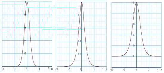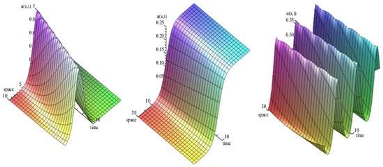The exact solutions of the generalized SIdV Equation (5) at . The left is a bell-shaped solitary wave solution (51); namely, when , and , the middle is a bell-shaped solitary wave solution (59); namely, when , and , and the right is a bell-shaped solitary wave solution (60); namely, when , and .