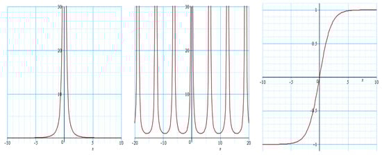 In Figure 2, one can see a singular solitary wave and a singular periodic wave for the -value of 2. If the singular solitary pulse is compared to the bounded solitary wave in Figure 1 for , the only difference is in the choice of . The singular pulse is obtained with a positive , whereas the bounded solitary pulse is found with a negative . Similarly, if one compares parameter values for the singular solitary pulse with the bounded solitary wave in Equation 23) when , it can be observed that the singular pulse is obtained with a positive , whereas the bounded solitary pulse is found with a negative .