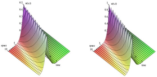 The exact peakon wave solutions of the generalized SIdV Equation (5) over the time interval . The left side shows a peakon wave solution (44)—namely, when and ; and the right side shows a peakon wave solution (55), namely, when and . The peakon solution is obtained when kink and anti-kink solutions (or two exponential solutions of the opposite forms) move in the same direction with the same speed.