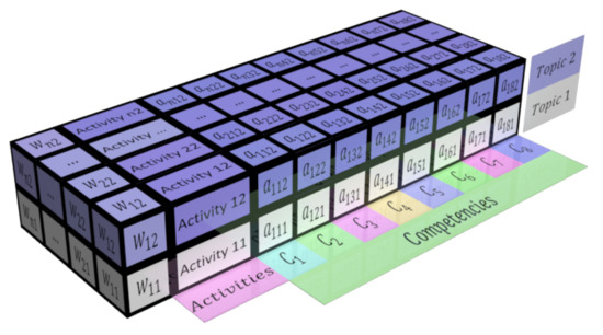 In brief, a TAC cuboid is a 3D matrix exuding the connection between activities, topics and competencies which are quantified by assigning appropriate weights in each topic-activity-competency knot, as depicted in Figure 3. Namely, element of the TAC cuboid represents the weight corresponding to the activity as impact on the competencies weighted on a curricular list of topics .