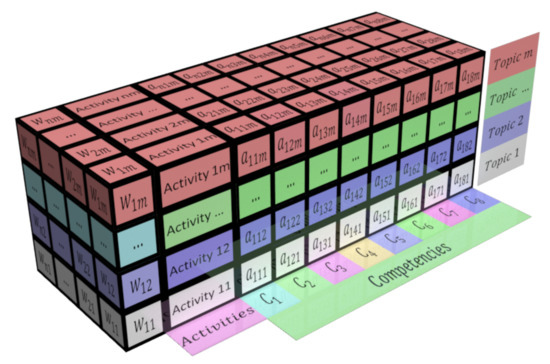 Table 1 can be considered as a 2D matrix that measures the impacts of activities on competencies related to a given topic (Topic 1), as shown in Figure 1, in which the elements have been changed by , where indicates the topic being evaluated.