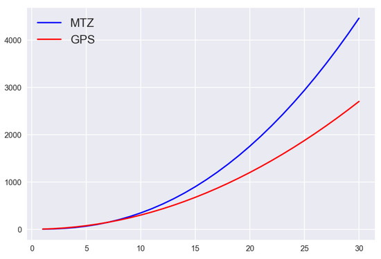 Benchmark between MTZ and GPS model based on the number of qubits. We can appreciate that for 30 cities, GPS model needs 2700 qubits while the MTZ 4458.