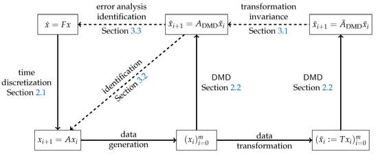 In this section, we present our main results. Before discussing system identification for discrete-time (cf. Section 3.2) and continuous-time (cf. Section 3.3) dynamical systems via DMD, we study the impact of transformations of the data on DMD in Section 3.1.