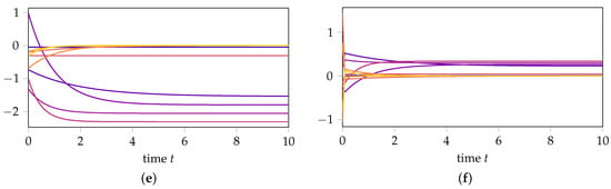 Comparison of the exact solution, DMD approximation, and DMD approximation based on transformed data for initial values inside the reachable subspace, i.e., and outside the reachable subspace, i.e., . (a) Exact solution with initial value . (b) Exact solution with initial value . (c) DMD approximation with initial value . (d) DMD approximation with initial value . (e) DMD with transformed data with initial value . (f) DMD with transformed data with initial value .