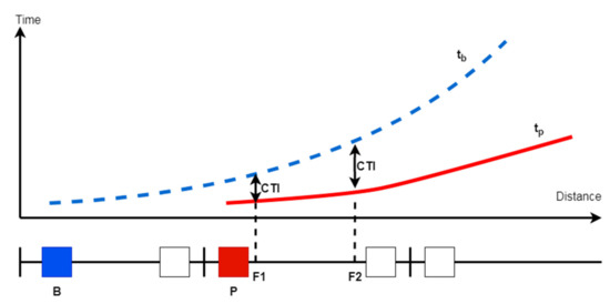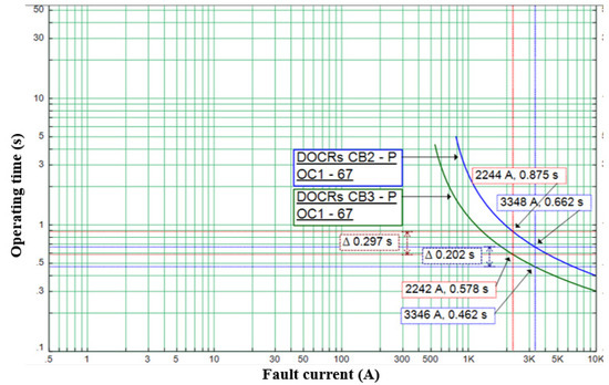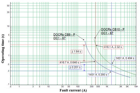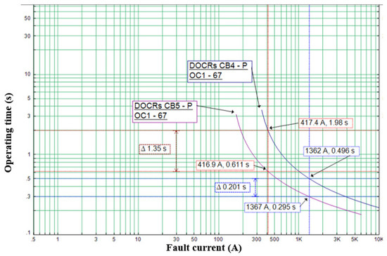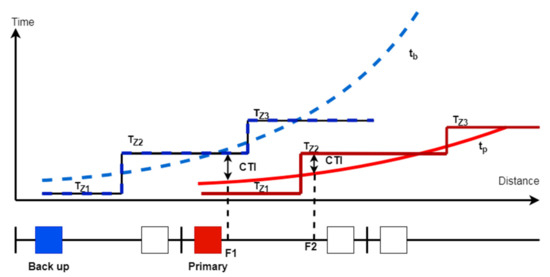Figure 2 depicts the relationship between DOCRs and distance pair relays. At the near end, the backup distance relay liaises with the primary DOCRs relay, and TZ2b must delay with the CTI as described in Equation (8). While Equation (9) describes the distance and DOCRs relationship at the far end. The second zone of the primary distance relay (TZ2p) must delay the primary DOCRs operation time () with CTI at the far end [27].