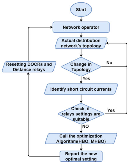 Figure 3 depicts the flow diagram of APS while taking into account the impact of DG. The obtained data from supervisory control and data acquisition (SCADA) was optimized using the centralized processing server. These data will be generated by the proposed algorithms in the APS to reset the DOCRs and distance relays. The main points of the proposed APS flow chart can be described as follows: