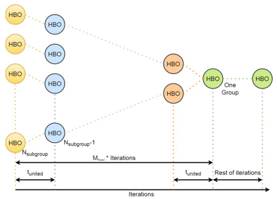 This point is about establishing small groups from search agents, these groups use HBO as an individual unit, then they are united in bigger groups until united in one group. As shown in Figure 4. The number of subgroups () are determined by the user.