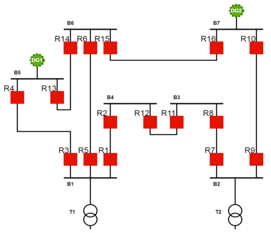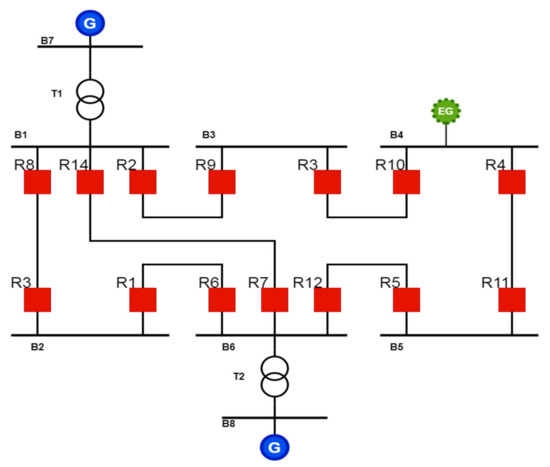 The IEEE 8-bus test system, shown in Figure 5, consists of 7 transmission lines connected between 8 buses and feeds 4 loads from two synchronous generators. These generators feed the network by power transforms T1, and T2. This configuration will be considered as the normal topology. In order to investigate the performance of the proposed APS for relays coordination, an external 400 MW microgrid (EG) will be integrated into the system at the fourth bus (B4). The test system has 14 CB, each transmission line has two circuit breakers (CBs), that are activated by the APS. Furthermore, the protection settings are allowed to be changed according to the change of the grid topology [31].