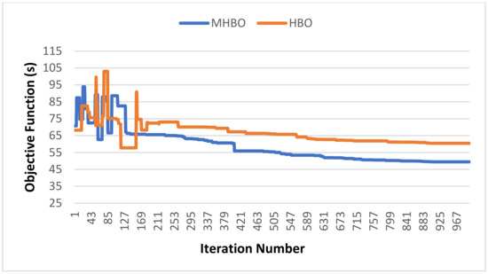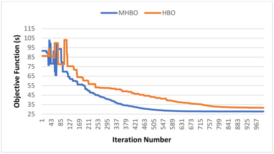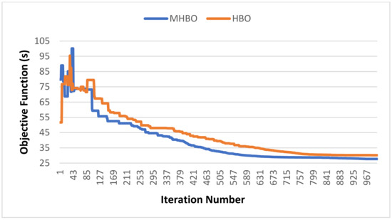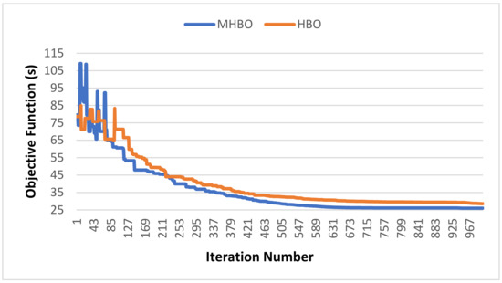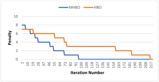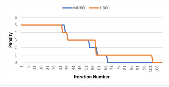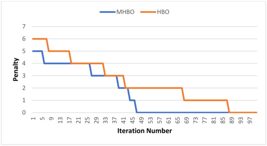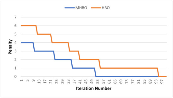 Figure 6 shows the convergence characteristics curves of HBO and MHBO in the case of the original case of the grid, whiles Figure 7 deals with the other case. The penalty is shown in Figure 8. This is for HBO and MHBO in the original case of the grid, while in the other case, the penalty is shown in Figure 9.