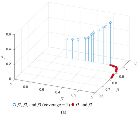 Pareto-optimal solutions of two objectives (f1 and f2) and three objectives (f1, f2 and f3) with coverage = 1 (a) and coverage = 0.965 (b).