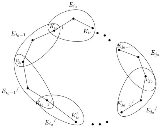 On the contrary, if and are not equivalent, then there exists a pair of edges , where is from and is from , such that . Since and , we have . Moreover, let be the edges such that , while for any . Then, the edges to and to will always form a cycle (see Figure 4) in any host graph of H, which is a contradiction. Therefore, and are equivalent. Thus, we can conclude that if H is a hypertree, then, between any two vertices, the entire knot-hyperpaths having the same length are unique up to isomorphism. □