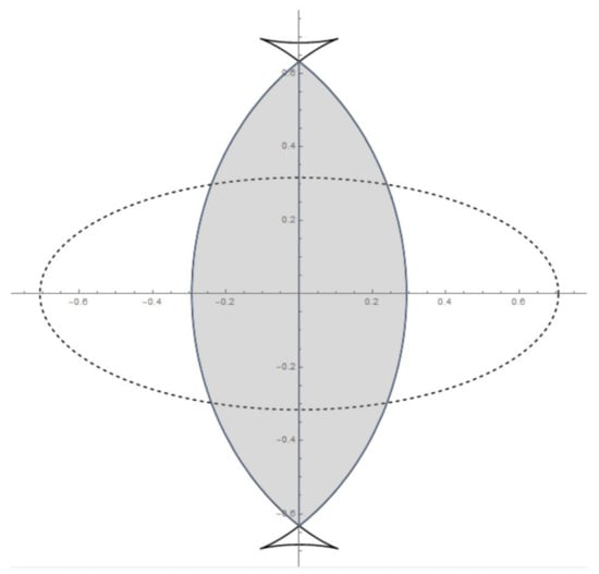 i.e., the interior of the outer parallel curve at distance one of the ellipse E. If , let F be the inner parallel curve at distance one of E. There is a connected component in the interior of F that contains 0, and its closure is set as . Figure 1 illustrates an example of how is defined.