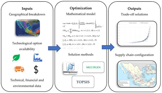 In recent years, the popularity of hydrogen as a promising sustainable energy carrier has increased significantly to contribute to clean energy transition []. In particular, hydrogen has a noticeable role to play in the transport sector which requires large amounts of clean energy as an enabler of deep decarbonization of this difficult to abate sector. One of the advantages of using hydrogen is the availability of different production processes []. The biomass contained in some agro-industrial wastes can provide enough energy to be used for hydrogen production in a variety of processes []. Several paths can be followed in biomass resource exploitation, among which the selection of the most appropriate conversion technology is challenging. Agro-industrial wastes are commonly known as residues that offer little benefit to their producers, so their recovery can be an option to investigate. The use of agro-industrial waste for energy production can be an alternative end-of-life for these resources by creating sustainable and renewable systems that minimize pollutant emissions. The cogeneration of electricity and thermal power could provide energy autonomy for these companies and additional income from the sale of their energy overflows, while their waste gets a second use. Applying the necessary technologies for efficient use of the energy generated from renewable resources requires a comprehensive vision that includes the assessment of several factors for decision support at different levels []. The objective of this work is thus to include these options in the planning and design of a hydrogen supply chain network.