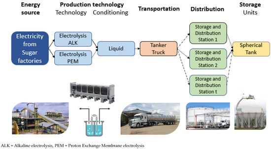 The presented mathematical model is inspired on three previously built formulations, whereby Parker [] adopts the profit maximization approach for its flexibility in terms of resource utilization, and de León Almaráz [] considers global warming criteria, and its mathematical formulation for transport and storage in an HSC is adopted by this study. Finally, Rico Contreras [] presents the mathematical model for generation of electricity at sugar mills available for hydrogen production; integrating these approaches contributes to the formulation of the mixed integer linear program (MILP), and significant changes were made to adapt the mathematical formulation to the case examined in this study.