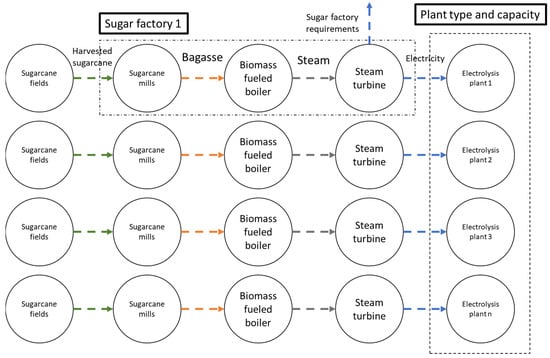 Production cost estimations start by calculating the tons of raw sugar cane that will be processed by each mill during harvest times. The amount of bagasse obtained from sugar cane processing and the amount of moisture it contains are also measured. These values are unique for every sugar cane mill and are represented by probability distributions obtained from historical production records. Humidity measurement is used to determine bagasse energy potential []. The amount of bagasse that is used in each mill to generate steam in the boiler rooms during each period depends on the energy consumption behavior of the mill. The steam production dedicated to power generation in each period is estimated using the theoretical efficiencies of the boiler and the bagasse energy potential, also considering the fraction of the dead time operation. Using the amount of steam used to generate electricity, the amount of MWh generated in each period is calculated. Some of this electricity is used by the sugar factories for their daily activities, whereas the overflows are usually fed into the national electricity grid and sold to other organizations. In the proposed model, the energy overflows are used for hydrogen production, whereas their availability is different for the harvest and non-harvest periods.