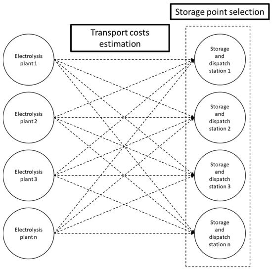The hydrogen transport module focuses on estimating the capital and operating costs arising from hydrogen distribution activities throughout the supply chain, from the production facilities to the delivery of the hydrogen to the storage and dispatch stations (SDSs)—these are the endpoints where the hydrogen would be stored before they are delivered to the refueling stations (refueling stations are not considered in the actual model). In the analysis, the SDSs are considered as the final stage of the proposed supply chain design (as presented in Figure 4). The amount of greenhouse gas emissions caused by transport activities is also estimated. To achieve this, the optimization model determines the hydrogen flow in tons per year, considering the hydrogen that is generated in both harvest and non-harvest seasons. The model then evaluates the convenience of transporting the hydrogen generated in each electrolysis plant to each storage location; the most favorable network configuration relies on the active objective function. When optimizing with multiple destinations, two main factors influence this decision: the shipping distance (an aspect that has a direct impact on transport costs and equivalent CO2 kg production), and the selling price of hydrogen at the storage locations, a value that relies on the SDSs’ location selected to receive the determined amount of H2, which has a direct impact on the income generated.