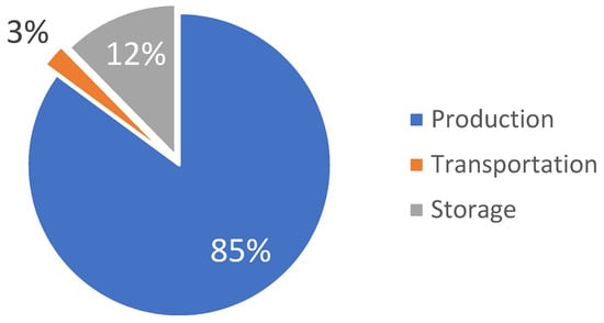 The total profit of the system is calculated as the difference between the revenue obtained in the storage station and the increase in production (CProdt), transport (CTransit), and storage costs (CAlmt) achieved in one year of operation. Equation (8) describes the calculation for this statement.
