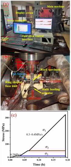 The true triaxial testing system (Model TRW-3000) used in this study was developed by the Advanced Research Center at Central South University, China, and the detailed parameters of the testing system have been described by several literatures [31,32,33,34,35]. The test system can apply quasi-static loading along the direction of the three principal stresses independently through hydraulically driven pistons, with a maximum load capacity of 3000, 2000, and 2000 kN along the vertical (z), and horizontal (x and y) directions, respectively. The loading system is shown in Figure 1a,b. The plate has extremely high stiffness and rigidity in order to transfer the load into the rock specimens. Five groups of tests for σ3 values of 10, 20, 30, 50 and 100 MPa were conducted. In the test settings, σ1 was applied along the z direction, σ2 was applied along the y direction, and σ3 was applied along the x direction. The loading control mode was set to a loading speed of 0.3 MPa/s. The loading paths of the tests, as shown in Figure 1c, are as follows: