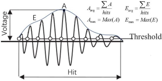 Rock fracture is the initiation and propagation of microcracks until they form macrocracks, inducing rock fraction [44]. When a microcrack is formed, the AE sensor is triggered multiple times to the vibration wave whose voltage exceeds the threshold. An AE hit is a vibration wave detected by an AE sensor, as shown in Figure 2, in which the analog signal is converted into a digital signal by the collector. A complete wave is an AE hit. Theoretically, the number of AE hits is positively correlated with the degree of internal damage of the rock.